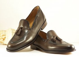 Zapato de vestir de la firma Luis Gonzalo fabricado con piel de primerísima calidad en color marrón oscuro. Lleva adorno de borlas en el empeine. Tiene suela de cuero cosida y sus forros y plantilla son, igualmente, de piel de gran calidad. El tacón tiene unos dos centímetros.